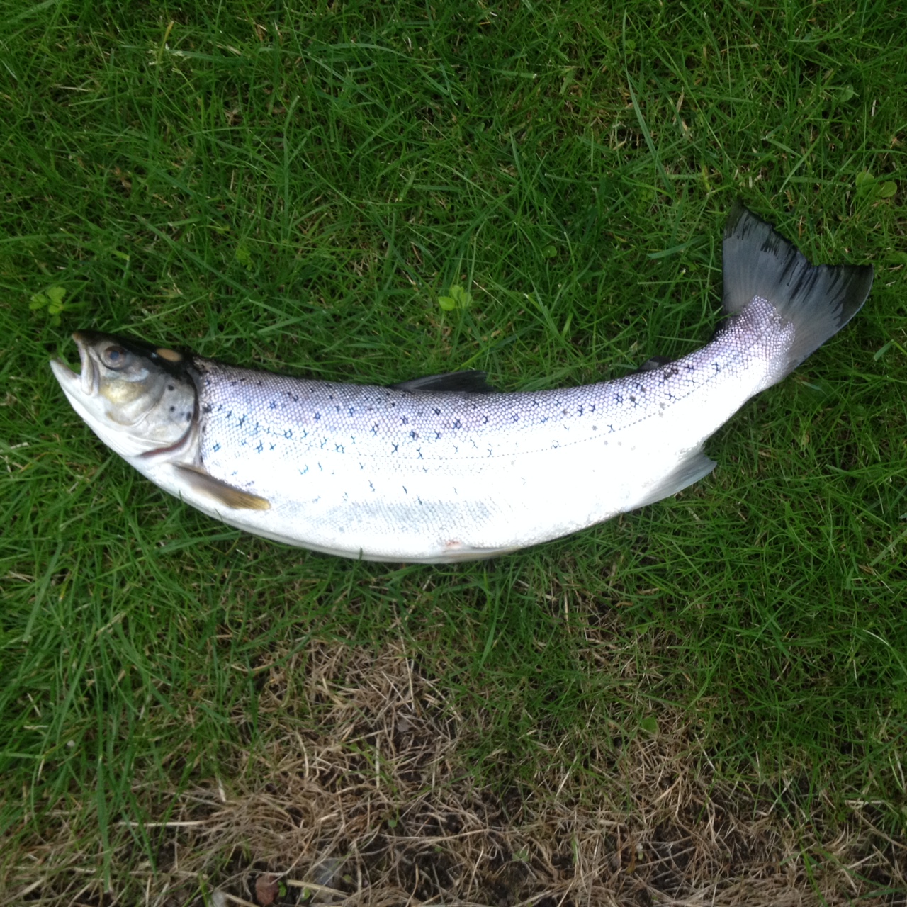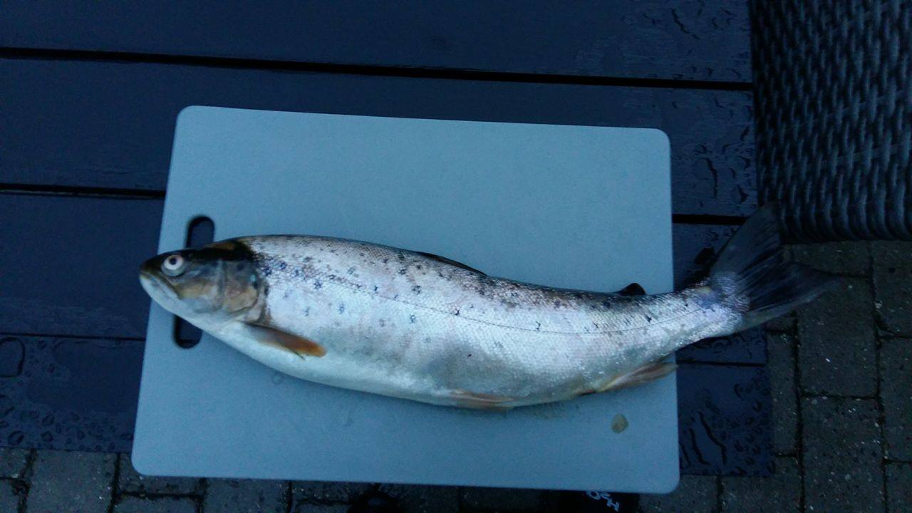 Grønlænder 55 cm. På der yderste stykke nedenfor rastepladsen. Herlig fight. Manglede det øverste hjørne af halefinnen og havde friske skader i hovedet, måske garnskader