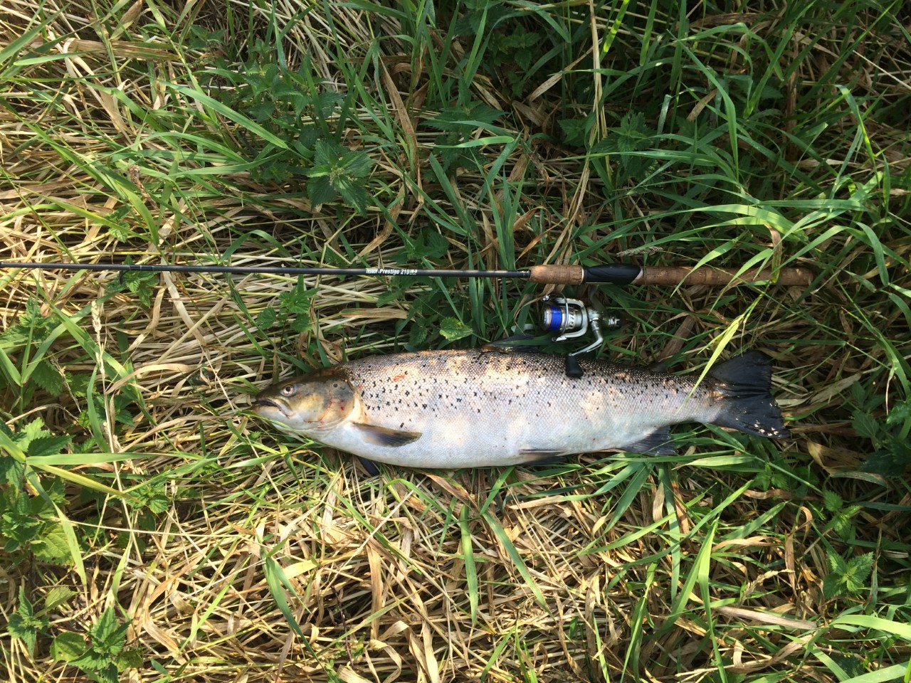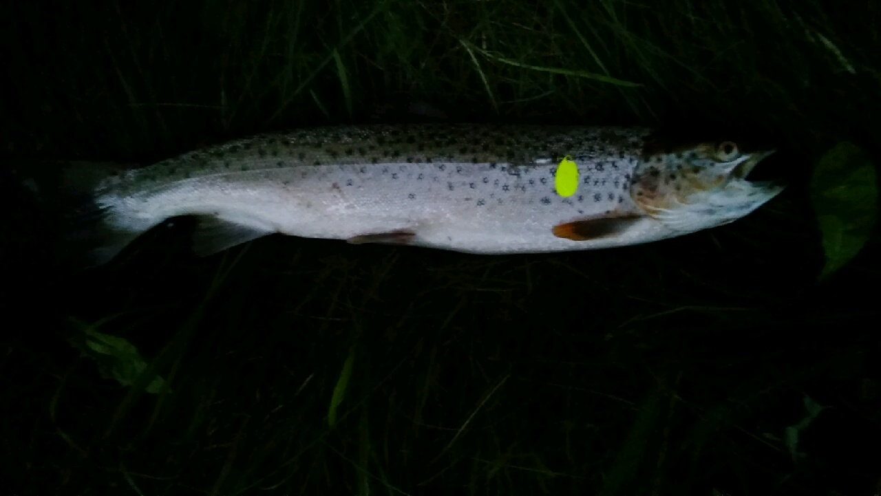 Den lille havørred sprang lige op ad vandet flere gange. Havde også et lille bækørred på ca. 25 cm oppe at vende og havde også kontakt med fisk et par gange uden at få dem kroget ordentligt. Så en god aften ved åen. Fiskede opstrøms cementbroen på det lige stykke mod Boltrup. Ville egentligt helst bruge fluestangen, men pga. mandshøjt græs og siv valgte jeg at bruge spinnestangen.