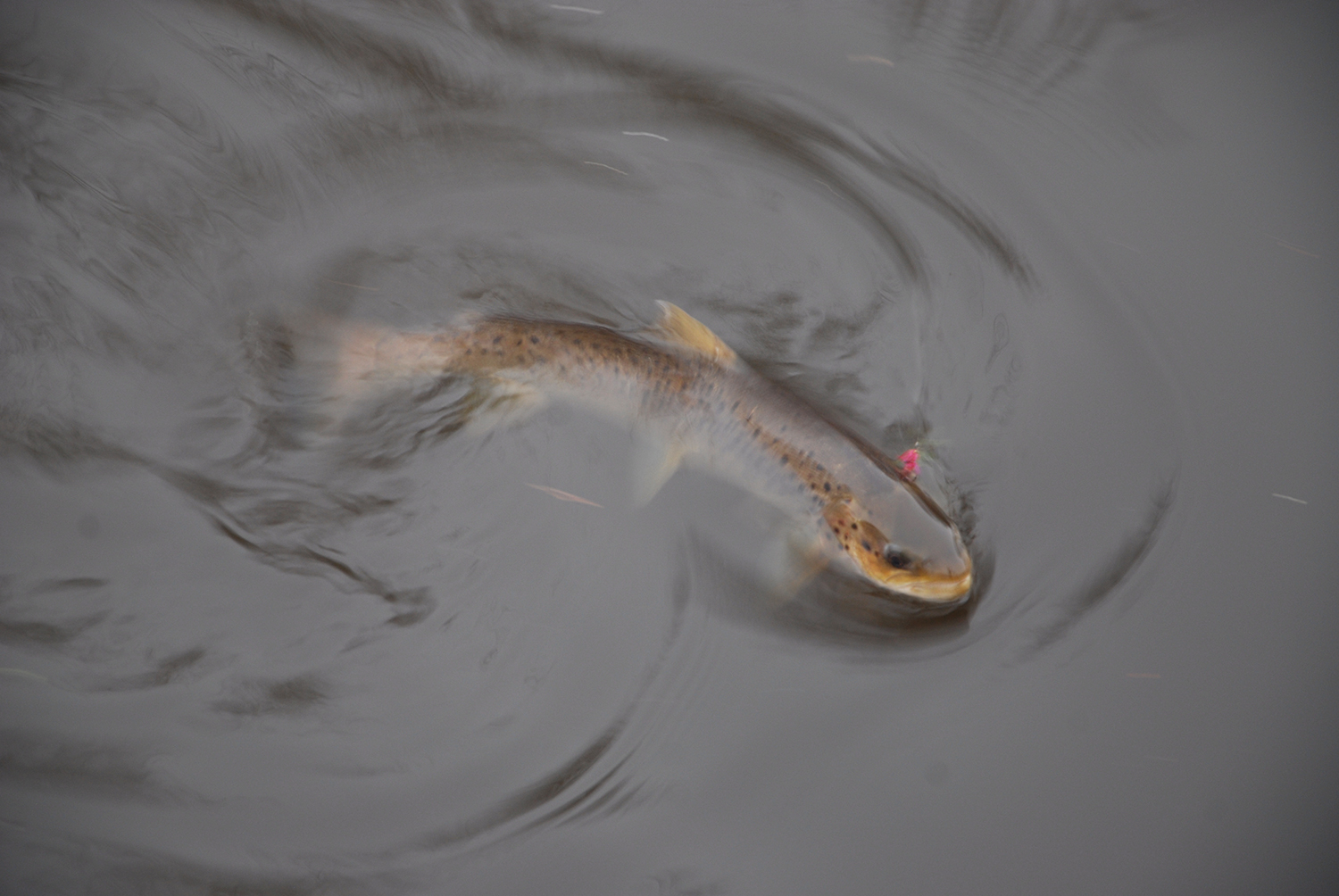 Vandstanden var klart til den lave side, men alle de høller og kendte pladser blev forsøgt. Jeg havde fisket så længe, at det kom som en overraskelse, da en livlig fisk endelig tog min lille lyserøde reje. Det var slank, men fin nedgænger på 50-55 cm. og da den modhageløse flue selvfølgelig mistede sit greb, da ørreden lå i nettet, var dagens eneste fisk tilbage i vandet i løbet af 10 sekunder.