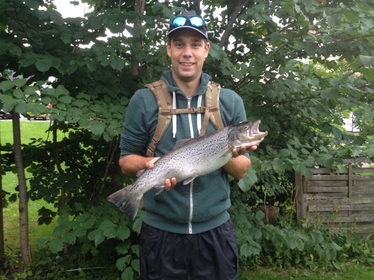 Tog til den store parkeringsplads ved Gunderup og gik ned til åen. Jeg startede fiskeriet lige efter stykket med fiskeri forbudt, og i anden kast fangede jeg denne fine havørred på en wobler købt på Hjallerup marked. Fisken fightede godt, men efter et stykke tid, kunne jeg tage den med fangstnettet. MIn første fisk i Trend Aa, 2,2 kg og 55 cm.
